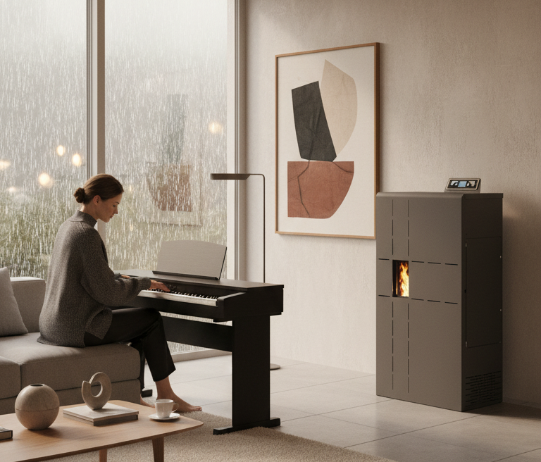 Una clienta con un piso de 70 m² en Burgos venía de radiadores eléctricos. Con una estufa de pellets de 8 kW, programador diario y buen pellet,
